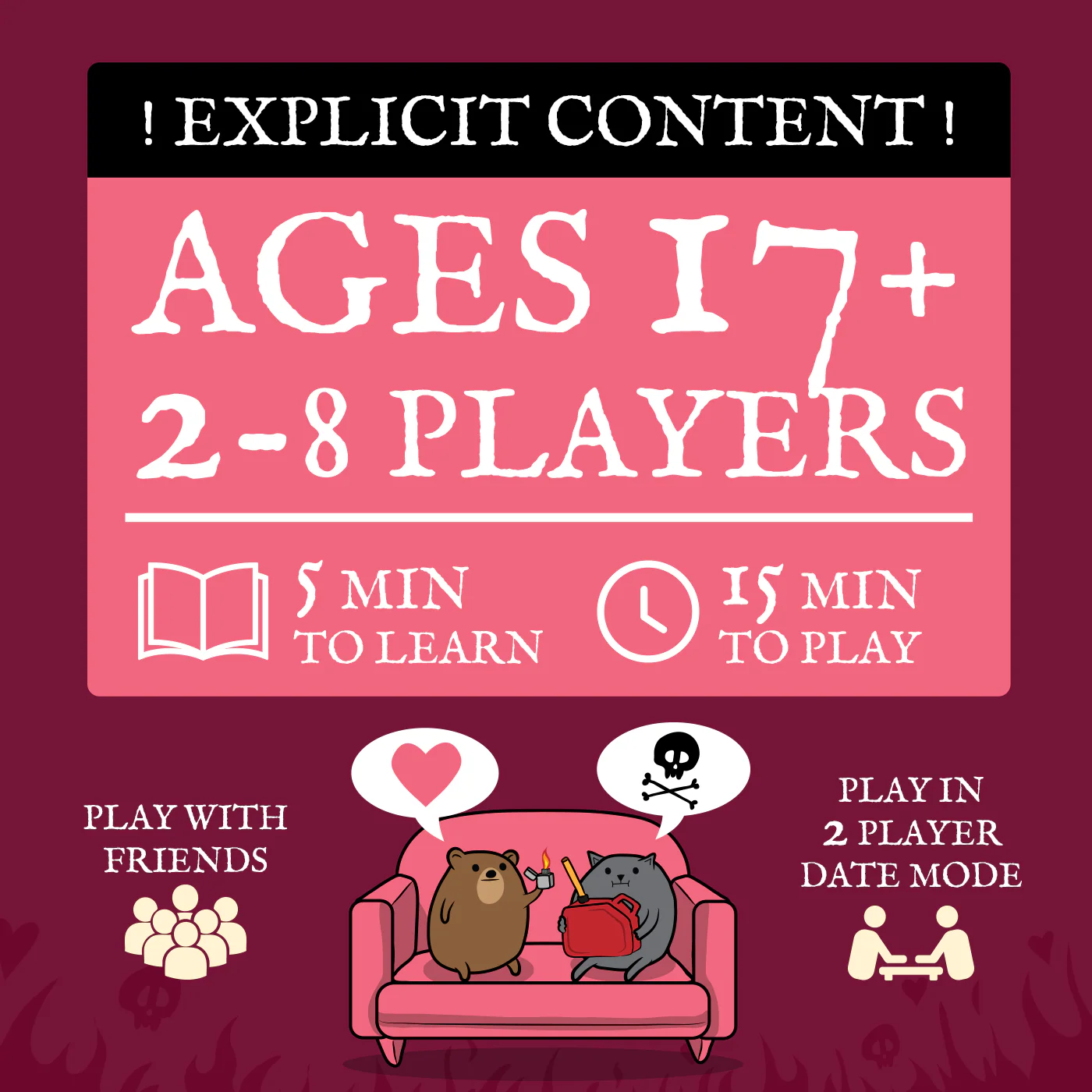With 2 - 8 players recommended you can invite other friends or couples to make their own horrible comics. Fast, easy, and endlessly replayable, Horrible Couple is the marquee comic strip like card game that can be enjoyed or gifted to anyone with a dark sense of humor.