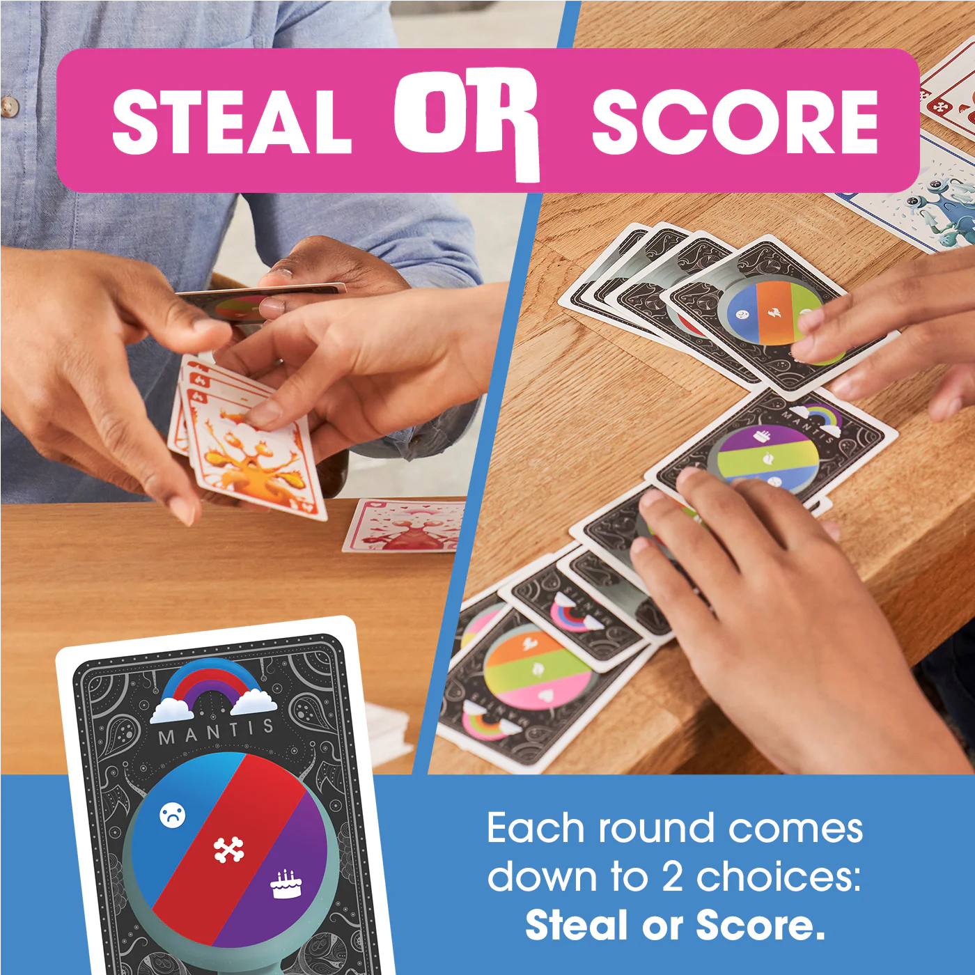 It’s easy to learn, and each round comes down to 2 choices: Steal or Score? That choice kicks off gameplay that’s energetic, unpredictable, and addictive.